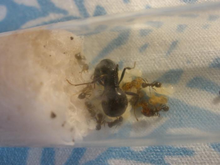 Вчера я стал еще одним счастливым обладателем матки мессора капитатус, сейчас "королева" сидит в темной коробочке в своих апартаментах, сегодня попробовал дать парочку семён так что пришлось их убрать и так же дал капельку меда ест с удовольствием