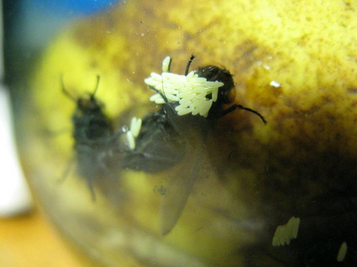 Ех... не хотел бы вас расстраивать, но это не дрозофилы, а обычные (так казать "туалетные") мухи. Для того чтобы разводить дрозфил возмите 3 литовую банку с фруктами и поставте на часа 4 - 5 может 6 на балкон. Туда должны слетется именно дрзофилы. Закройте быстро банку и сделайте дырки в крышке. Через 2 недели будете имет новых мух. Более подробно о доме для дрозофил читайте на форуме в разделе "Кормление"
