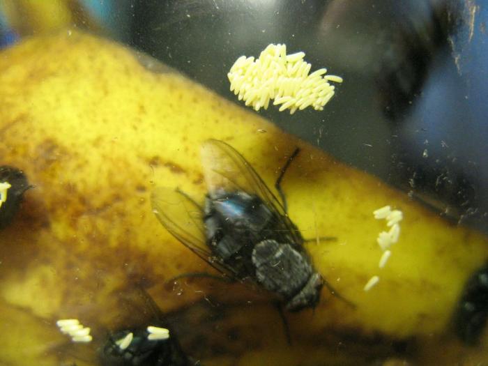 Через примерно 4 дня мои мухи отложили яйца, значит в банку Я кинул кожуру от двух бананов и маленький кусочек самого банана. Островок пока не установил потаму что ещё не нашёл что туда можно приспособить.