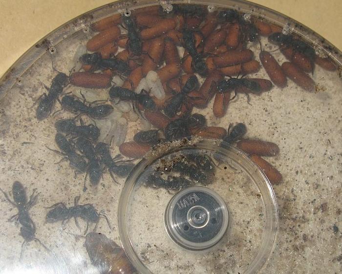 Муравей реально здоровенский! Одно дело фото, другое - увидеть его вживую. Очень медленные. Медленные во всем: движение, еда, развитие. Пока в семьях только кладки яиц. Думаю сделать для них в свободное время небольшие формикарии, т.к. в коробках от дисков за ними тяжело наблюдать и ухаживать + влажность трудно определить.