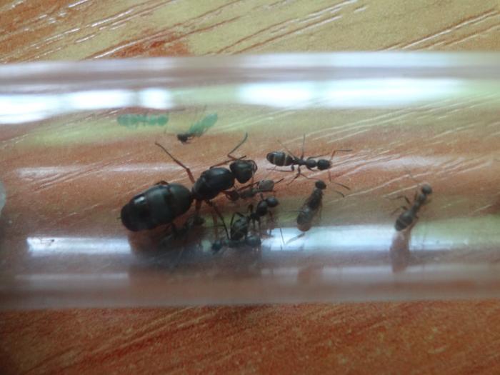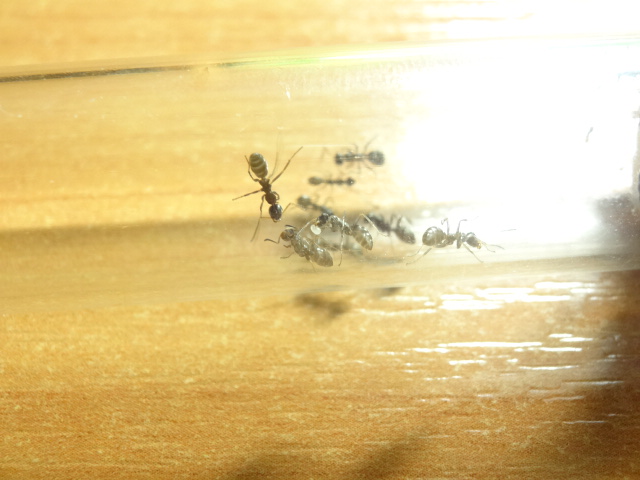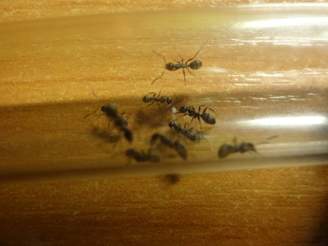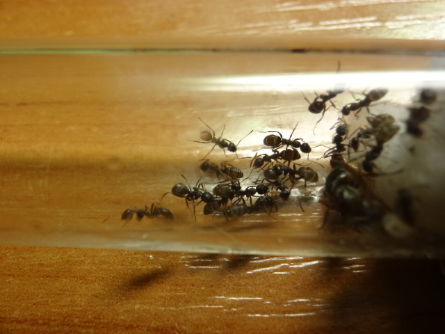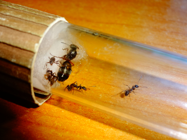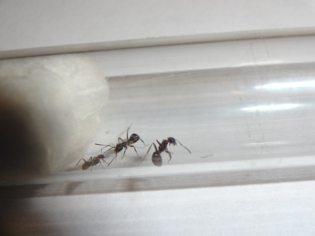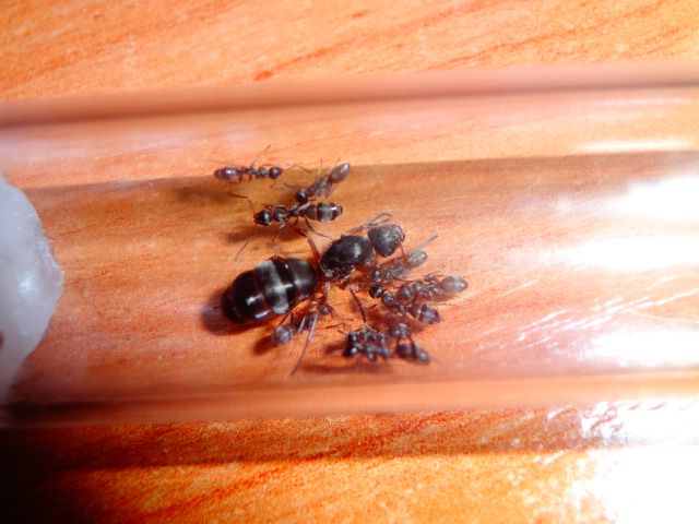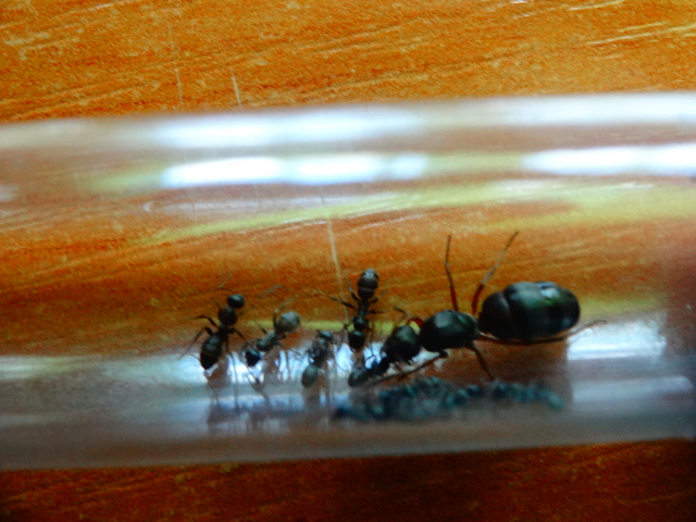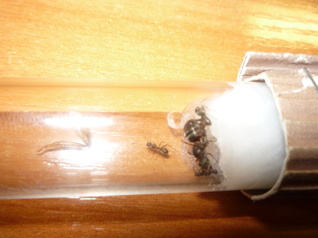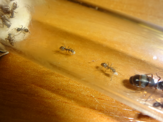 Все рабочие вышли из коконов, их четверо, боятся всего, что можно, яиц у них пока нету, закармливаю белком, каждый день по 5 дрозофилок, а сейчас дал ножку сверчка им понравилась.