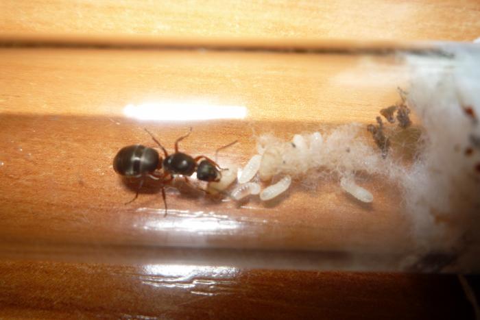 Прошло 2 недели, не ожидал от Серви такого быстрого развития, при температуре +25, только недавно были яйца, уже на личинках лежит сорванная маткой вата и есть 1 кокон, скоро появится первый рабочий, и будет начат старт муравьиной жизни семьи...