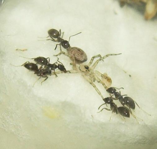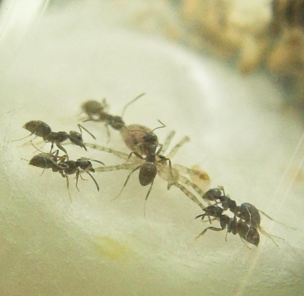 Первое мгновение паук пронесся по матке с расплодом, началась паника, но буквально через несколько секунд один рабочий ухватил его за ногу, тут же подсуетились остальные. Несмотря на то что они первый раз видели другое насекомое, была применена стандартная тактика "распятие", обратите внимание на симметричность расположения: по двое сбоку, один сзади, передний же подгибал брюшко к голове паука (кислота?). Уж не знаю, что они там делали, но через пару минут паук уже не подавал признаков жизни. Свалив добычу они начали её разделывать, через ещё несколько минут подтянулась матка собственной персоной)