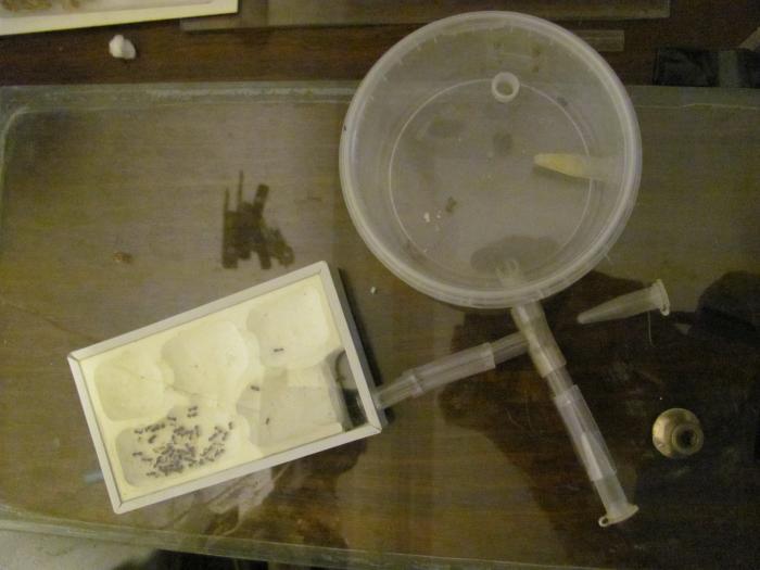 Как сидели в одной камере так и продолжают сидеть, хоть бы на разведку сходили чтоли. Кинул им моль прям в формикарий сели. На арену не ходят сироп и виноград не едят. И так пару дней. Накидал на арену всякой мелочи, мелкого мучника, мелких тараканов, моли и её личинок. Но им лень туда ползти. Убрал длинную трубку до арены осталось сантиметров 7. Живность с арены уже начала наползать в трубку и в формикарий, некоторое время часть муравьёв сидела в новом блоке а часть в старом, а между ними в трубке жил тараканчик. Личинка моли и ещё один тараканчик жили в мусорке прям в соседней камере.