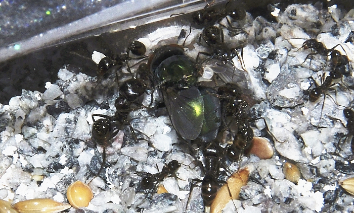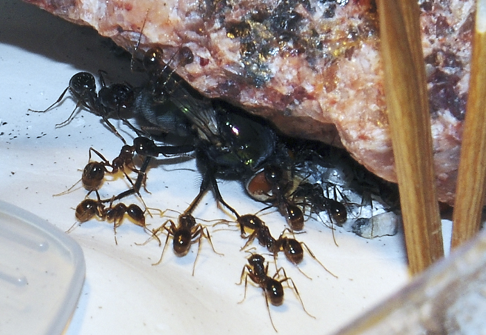 Давненько не баловал муравьев "натуральным" белком. Да и не очень то жаловали мураши мух. Но вот семья подросла и вкусы изменились.