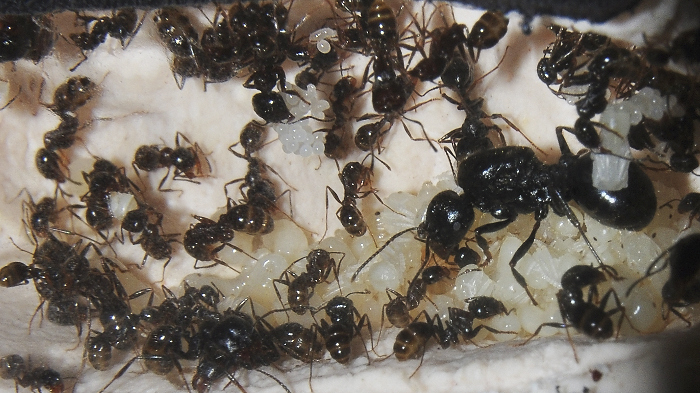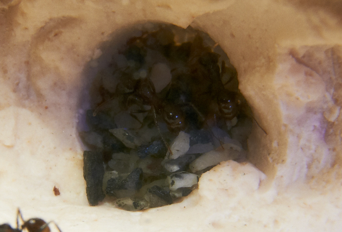 Очень даже возможно. Я попытался добиться градиента влажности с помощью герметичных перегородок. Но вероятно влажность в таком маленьком объёме очень быстро выравнивается. Тем более, что муравьи заложили вентиляцию. Понаблюдаю, как они себя поведут с уменьшением влажности. Прошла неделя, пока все в норме. Смертей не наблюдается. Аппетит хороший. Появился новый расплод.