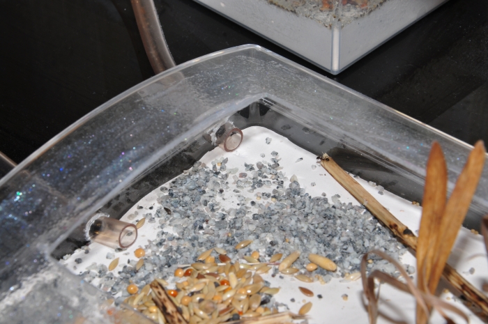Склады зерен у меня устроили аж в 3 камерах: там где матка и расплод, второй - в соседней чуть выше, а третий практически у поверхности формика. В третьей зерна даже проросли, но это скорее от того, что заселил в не до конца просохщий формикарий. Кстати сюда же они таскают иголки от сосны. Зачем не понятно, но как они (точнее он) их засовывает в норку - целая песня! Семена на арене находятся постоянно: их много разных (помимо смесей для канареек и попугаев купил смесь для грызунов там чего только нет). Заметил, что интерес к разным семенам они проявляют периодами: то мак лежит и ноль внимания, то начинают усиленно таскать. Даже муху могут игнорировать в течении нескольких дней.
