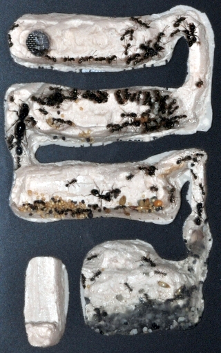 Но веть капитатусы не только большие, есть еще и мааленькие. Они пролезли под пластик, натаскали личинок и стали выращивать больших мурах.... дабы освободить мурашек форм пришлось ломать, а так как камера увлажнения была в самом низу было крайне сложно. С тех пор я решил, ничего в камеры к мурашам не совать, или они должны это грызть.