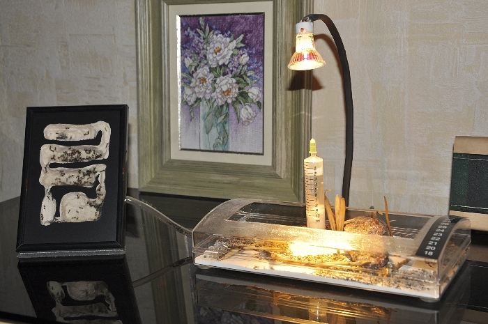 Может быть, и здесь вполне хватило бы лампы? Это же галогенка? она неплохо греет, только опустить её пониже и направить на крупный тёмный камень, расположенный на арене, под которым установить низкую коробочку-солярий, где можно и увлажнение предусмотреть, чтобы куколки не подсыхали, и прозрачную стенку для удобства наблюдения. Или же сменить лампу на накаливания подходящей мощности.
