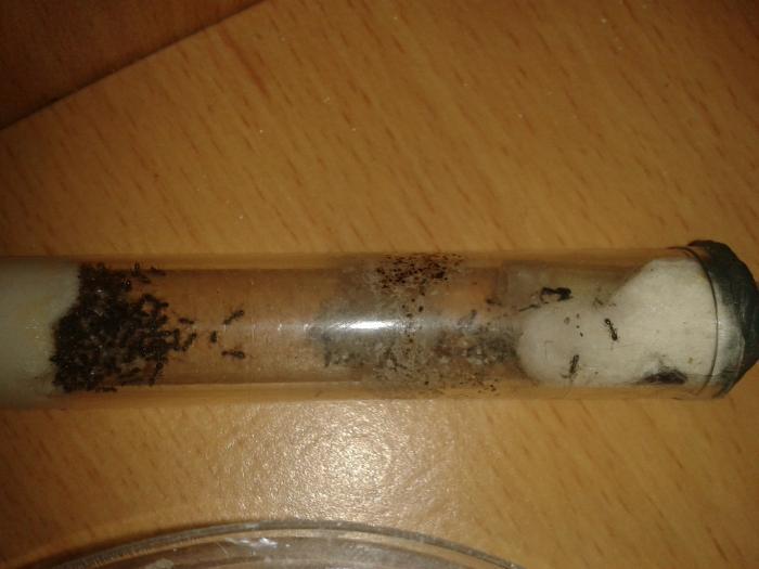 Т.к колония у меня вымерла по неизвестным причинам я не выкладывал фото. Сейчас с наступлением лета матка начала быстро развиваться(матка не умерла, умерли только рабочие...). Кинул несколько подкидышей и они быстро окуклились и появились рабочие. После чего семейка начала расти. Даю сироп. Почему-то на белок сильно не налегают. Больше на углеводы. Живут в пробирке с ареной. Количество голов не могу подсчитать. Одна, единая, черная масса рабочих.