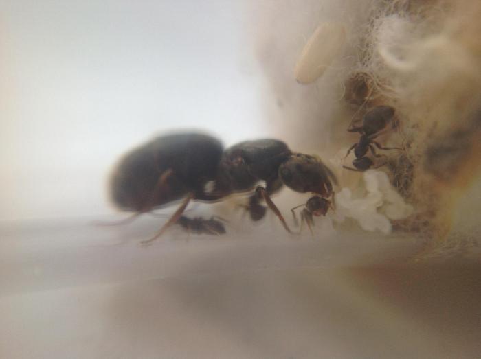 lasius niger. Предистория: поймана во время лета в спб, личинки развивались крайне быстро. В колонии 5 рабочих, коконы личинки (не на всех стадиях) и пакет яиц. Подкидышей нет и не было. В качестве корма довал им мраморного таракана и сахарный сироп. большую часть суток проводят в темноте, за исключением кормлении и фотосъемки. Иногда кладу пробирку на термоковрик.