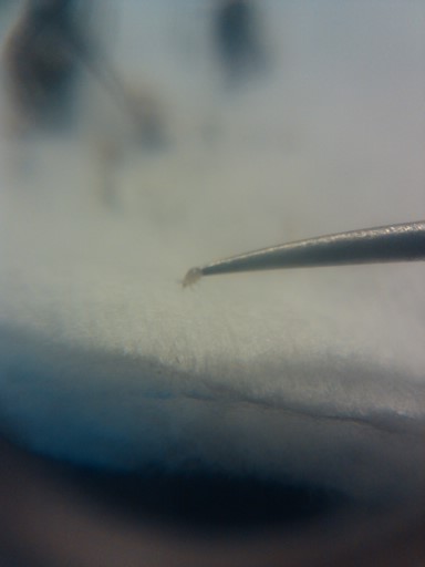 Недавно умер один венатор. Пару дней пролежал на арене (не убирал поскольку он ещё шевелил лапками). Сегодня обнаружил на нём странные белые точки, невооружённым глазом было видно что они перемещаются. Достал его, посмотрел под лупу - он весь облеплен какими-то маленькими насекомыми, с виду напоминающими лесных клещей, с тремя парами лапок и огромным почти прозрачным брюшком. Нормально сфоткать возможности нет, выкладываю что получилось.
