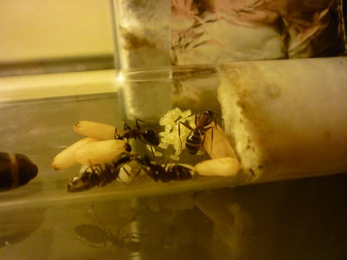 И чтобы не плодить новые темы, задам тут вопрос. В общем, в колонии появилась странная личинка. Видно на втором фото. Странная она тем, что во-первых длиннее остальных, какие только появлялись в колонии, во-вторых, очень заметно сегментирована. Ранее я наблюдал личинку солдата - она была значительно толще, и цвет у неё был как и должен быть - белый. У этой же цвет ближе к жёлтому. Похожие личинки я наблюдал и у эфиопсов, наравне с обычными. Вода у обеих колоний в достатке, пища тоже. На последних двух фото изображена колония эфиопсов, на первом у рабочих в зубах обычная личинка, а на второй у стекла жёлтые.