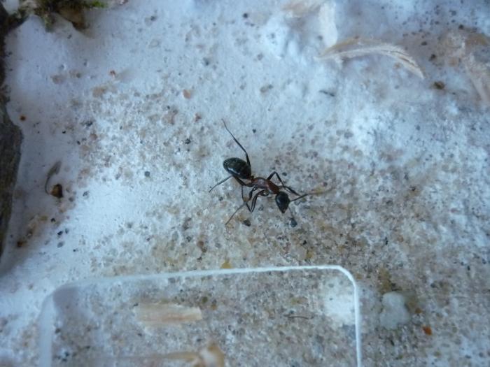 В колонии camponotus ligniperda случилась очень неприятная ситуация - один мурашка вывернул себе переднюю лапку. Как это произошло - неизвестно. Это очень сильно мешает ему. Лапка вывернута вниз, под торакс, из-за чего ему стало сложно ходить. Сейчас рабочий вышел на арену, держится подальше от входа. На вид, это один из рабочих с более тёмным хитином т.е. из первого поколения. Что с ним сделать? Колония довольно маленькая, только вышла из зимовки, около 10 рабочих, и похоже это был самый активный фуражир.