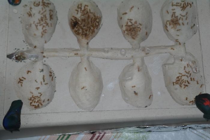 "Эксперемент" с глиной пришлось прекратить... Дело в том что она стлала сильно трескаться. Это произошло, видимо, из-за возникновения градиента влажности. Флавусов я захотел переселить в формикарий, недавно мною сделанный. Но у флавусов на это были другие планы и я увидел как они начали перетаскивать коконы и даже личинок в свои "подглинные" ходы. Пришлось их немного "побеспокоить", как оказалось флавусов в глине было уже предостаточно. Как только я немного разрушил из глиняную крышу передо мной пристало пречудесное зрелище. Множество оранжевых, блестящих янтарных точек носилось взад и вперёд под глиной... Некоторые из них несли коконы, которые часто были больше самих носильщиков, некоторые переносили белёсых личинок а некоторые, даже грозди безукоризненно белых яиц... Я знаю что не очень хорошо было тревожить муравьёв, но представшее передо мною зрелище было и вправду очень красивым... Конечно фотографии всей красоты не передадут но всё-же выложу несколько из них, на некоторых хорошо видна дифференциация рабочих. Недавно я, например, видел кокон едва превышающий двух с половиной миллиметров длинны. Но так-же в колонии уже имеются коконы в которых, по видимому, покоятся, дожидаясь своего часа быть полезными колонии, рабочие пяти миллиметров длинны... Не знаю зачем флавусам такой сильный "разброс" в размерах рабочих, но во всяком случае им лучше знать. Моя "работа" лишь обеспечивать их достаточным количеством пищи, кровом и радоваться. В колонии, по моим скромным предположениям, сейчас число рабочих должно стремиться к двум сотням особей... Коконов, во всяком случае, сейчас не менее 50-70 штук. Фото располагаю в хронологическом порядке. На них присутствуют как фото незатронутого так и фото подпорченного уже (вашим покорным слугой) гнезда.