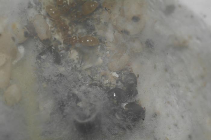 P.P.S. За ночь флавусы очистили от плодовых тел почти всю плесень и теперь там деловито похаживают и что-то перекладывают и пожёвывают ;).