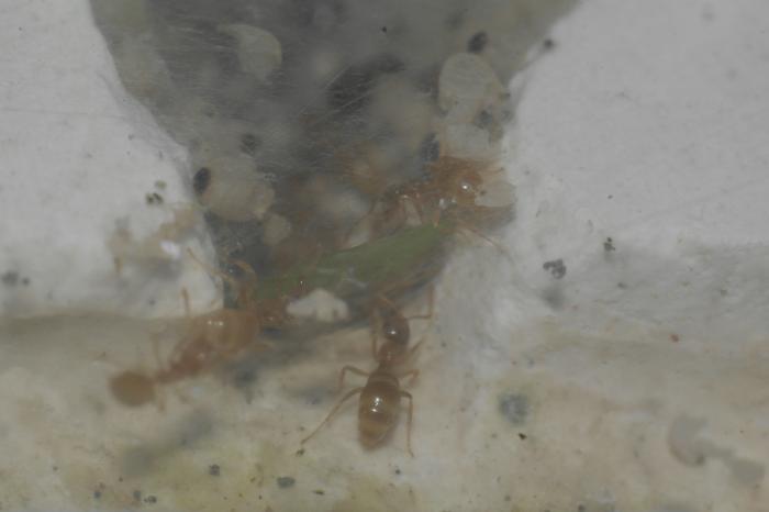 Колония у меня с конца лета 2012. Пожалуй первая из моих колоний в которую я не подкидывал коконов. Сейчас довольно быстро развиваются, матка часто откладывает яйца, но быстро из-за этого худеет. Численность около 23 голов. Приходится кормить каждый день что-бы поддерживать её "толстое" состояние. Муравьи привередливые, засохших тараканов не жуют, так-что каждый день приходится нового класть. Пробирка довольно сухая, воды нет, только вата осталась чуть влажная (судя по всему из-за этого тараканы так быстро и сохнут). Переселяться ни в какую ни хотят. А так-как эту колонию я решил поднять "по инструкции" то пришлось отказаться от моего любимого способа переселения-вытряхивания в новую пробирку, эффективного но как правило с потерей части расплода. Я не как ни могу понять куда девается сироп. Даю вроде-бы прилично. Сироп весь выпивается а на следующий день муравьи опять "похудели".