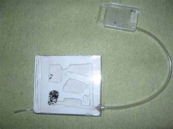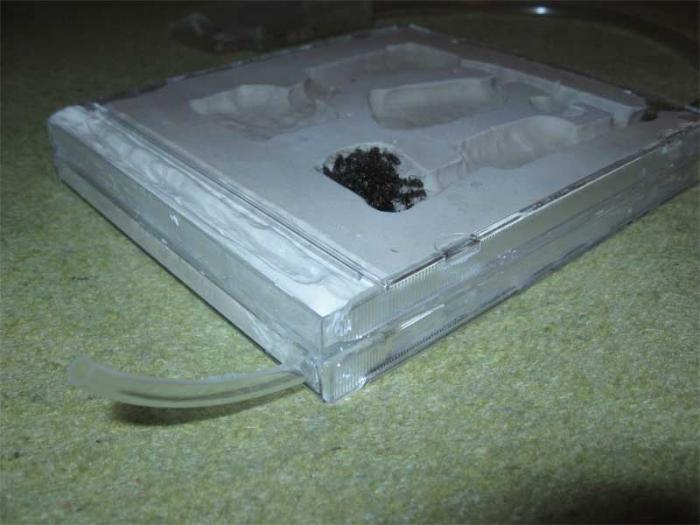 Это обычная коробка из под компакт-дисков. Из нее вытащен дискодержатель, спилены 4 "полушайбочки" на стенках крышки и залит алебастр. Ходы резал бормашинкой не вынимая плиты. С раствором я похоже промахнулся, нужно было делать погуще, у меня был вообще как водичка. Для увлажнения используется канавка слева. Если кто-то будет повторять конструкцию, то:
