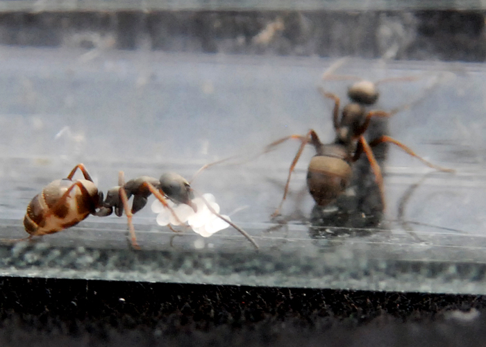 Сейчас в семье 7 рабочих и большой пакет яиц, личинок и куколок нету. На фотографии в жвалах у няньки только половина яиц - остальное у другого муравья было. Пора уже переселять в новый инкубатор - в старом вода почти закончилась. Вот думаю, может сделать им маленький формик на 2 камеры? С другой стороны в пробирке влажность стабильнее...