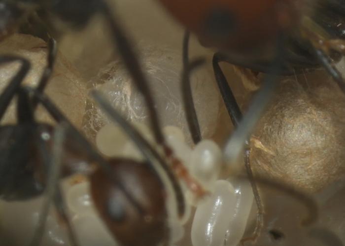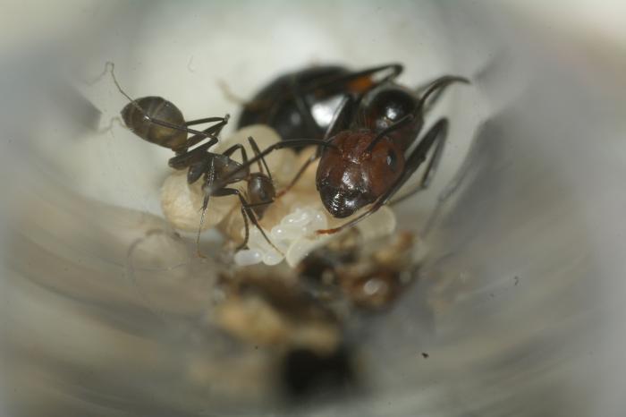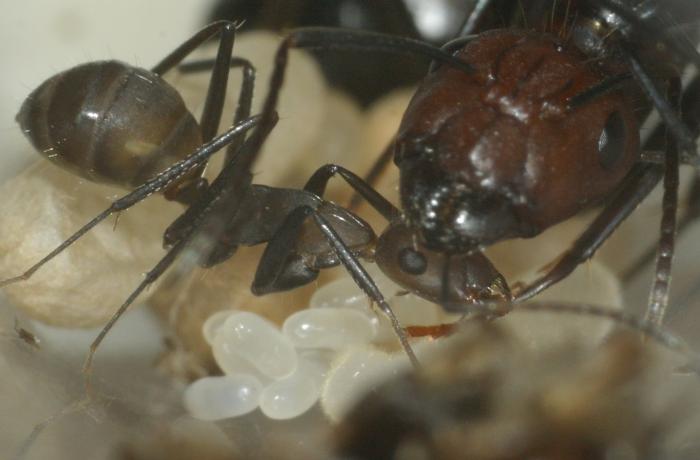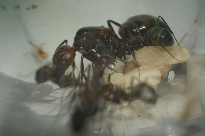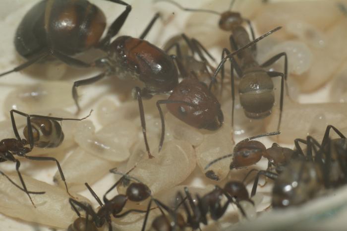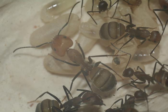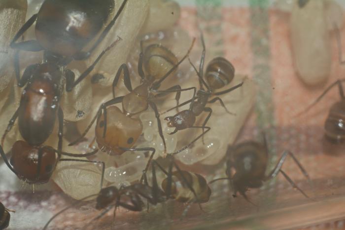 Этих прекрастных представителей рода Camponotus я получил в подарок от admin-а (за что огромное ему спасибо!). Это блог не обычный а спаренный (т.е. писать я буду об 2-х колониях). На данный момент в колонии Camponotus nicobarensis находятся 2 рабочих, яйца и 4 кокона. Колония валяясь возлежа (причём в прямом смысле слова) на коконах. Иногда она встаёт, немного по перекладывает и покормит яйца, но потом опять ложится. Надеюсь что матка париуса с появлением рабочих тоже станет несколько гхм... "ленивее". А вот несколько фото обеих цариц. Грозные жвалы матки париуса (которые совсем не мешают ей быть заботливой мамашей) и "ленивая морда" (матка nicobarensis-а) с отпрысками.