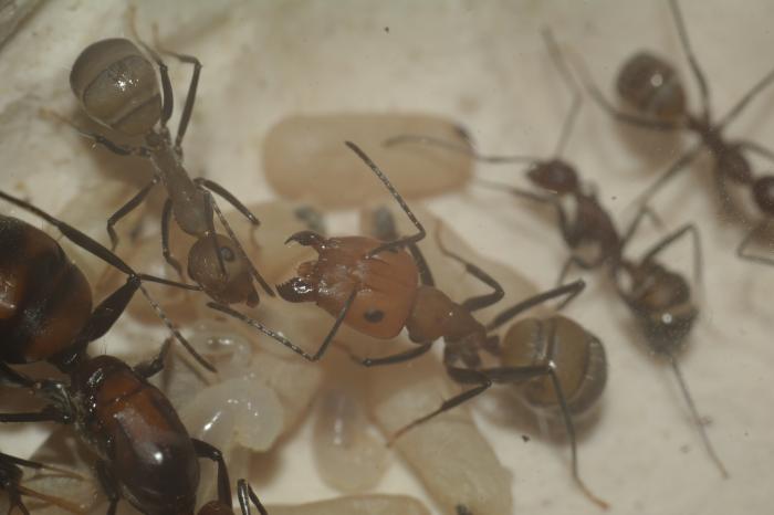 Ура! 10-м членом колонии никобаренсисов оказался солдат! На подходе ещё 2 вояки и много рабочих (всего 13-14 коконов). У матки париуса примерно дня 4 назад появились личинки (ну и медленные-же они). Фото солдата прилагается ;)