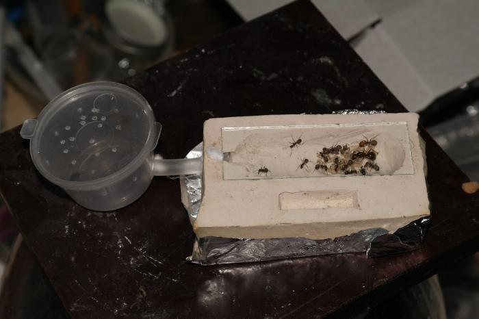 Сегодня знаменательный день для колонии кампов. Они переселились из пробирки (которую они не сильно, но загадили) в 1-камерный мини-формикарий! Перебежали все 15 членов колонии (считая матки) минут за 5, стоило лишь посветить и разок-другой тряхонуть. Фото, разумеется, прилагаются.