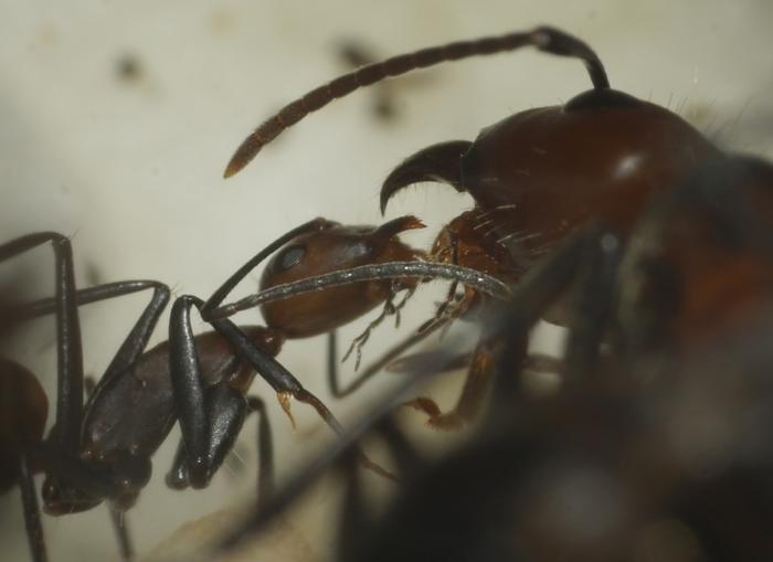 Товарищи Camponotus nicobarensis быстро развиваются. Их маленькая личинка (размером чуть больше яйца всего за 3 (!) дня стала уже размером с половину рабочего муравья :). Крупная личинка окукливается. Все очень толстые, довольные и почти не боятся света! Матка париуа... эм... ну... снесла ещё 1 яйцо, теперь их 4 :).Не очень-то выдающийся результат но не буду её обижать. Сумел-таки сделать фото которое хотел, а так-как последняя фото сессия была довольно продуктивной то и ещё пару тех которых не хотел (хотя они мне понравились, даже очень :) ). Посему выкладываю мои "результаты" здесь (матку париуса не фоткал, она так от света бесится что я боялся появления белой слюны и прочего...) .всеми любимый обмен жидкой пищей трофолаксис.