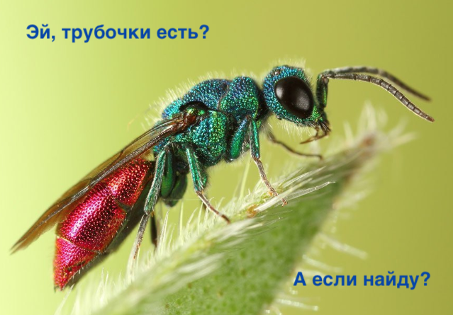 И не забывайте о паразитах! Маленькая муха сидит обычно на гнезде не просто так, а с целью проникнуть туда (однажды трипоксил поселился в прозрачной трубке, но вместо развития осы, я наблюдал развитие мух тахин). Да и разные наездники и хризиды не прочь испортить нашим перепончатокрылым питомцам жизнь. Таких подозрительных насекомых лучше отгонять.