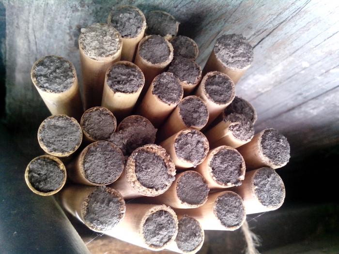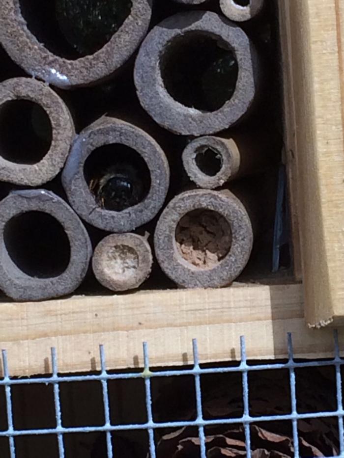 В нескольких старых домиках были трубочки разного диаметра. Осмии и "худые осы" заселили исключительно трубочки "карандашного" диаметра, более тонкие пока пустуют.