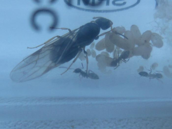 Не тот стаж,чтоб муравейники копать,тем более с лазиусами,матка осталась с крыльями.