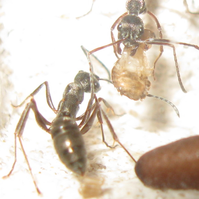 Вот первая колония, которая через пару месяцев должна (пусть только попробуют не стать!) стать полноценной. Три рабочих вскрыли кокон с рабочей особью, сохранили ей жизнь и геммы.