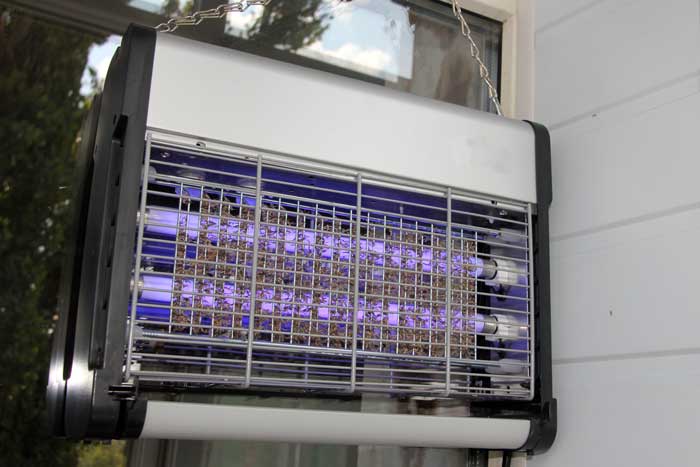 Поставил такой девайс. Слабый ультрафиолет привлекает насекомых. Между прутьями высокое напряжение. Насекомое пролетает и вызывает на себя микромолнию. Падает в поддон или остается на прутьях.