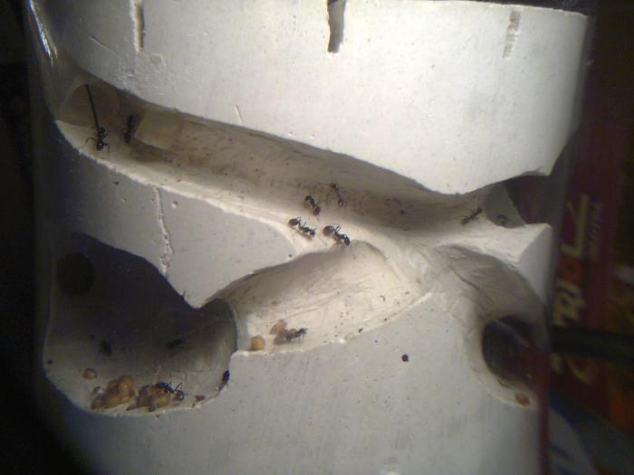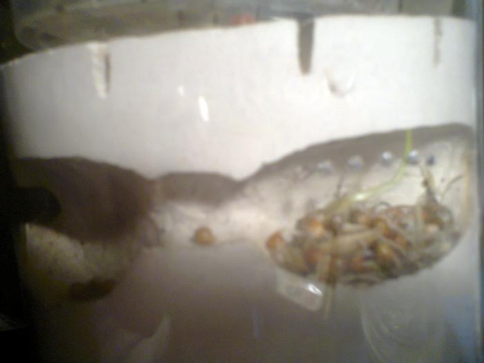 Мессоры пожили в пробирке без воды и с увлажнённой ваткой ещё 1 день. А вчера вечером подсоединила формик. На разведку бегали-бегали,но пробирку массово не покидали. Переночевала конструкция возле батареи в ванной - это самое тёплое место. Сегодня под вечер устроила их под лампу. За час управились. Если бы подсоединила свою широкую трубку на прямую к пробирке,то было бы быстрее. Но побоялась,что разбегутся, и соединила родную трубку со своей. Получилась длинная беговая дорожка. Формик затемнён,не буду фотографировать и беспокоить какое-то время. Но заглянув на секунду, рассмотрела,что матка с яйцами сидит на нижнем ярусе,где я и предполагала. Я ей специально проковыряла углубление в которое она сможет прятаться. крупные личинки тоже в нижней части формика лежат кучкой. На данный момент почти всё зерно перетаскали со старой арены. Лежит оно повсюду и в камерах и в коридорах. Надеюсь,со временем наведут порядок!