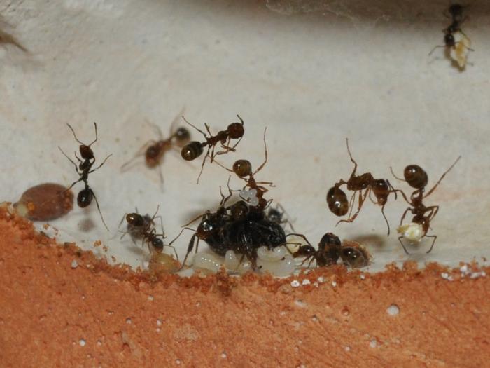 2- Сидят в камере под ареной. Это значит что слишком влажно? Иногда спускаются на один "этаж" ниже. В низ только "рабочие" редко забегают. Матка иногда прячется в закрытый с арены песком проход между ареной и камерой. Остальные бегают за ней с яйцами.