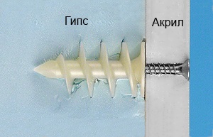 В итоге - саморез не имеет контакта с влажным гипсом, нет коррозии и загрязнения гипса ржавчиной, так как дюбель сплошной. Конструкцию легко разбирать - собирать.