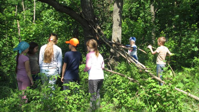 После объедания сладостями дети принялись активно сжигать калории. Играли в волейбол, жмурки, строили шалаш и по ходу наблюдали за насекомыми. Маша чуть было не кувыркнулась с обрыва, но всё обошлось.