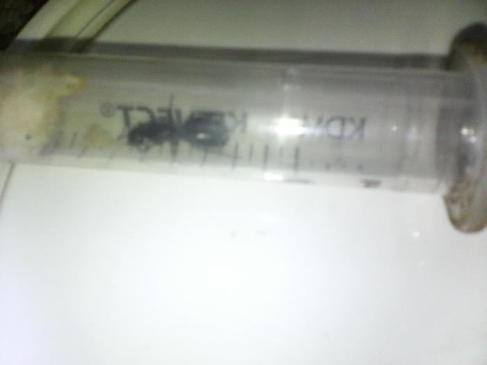 Через несколько дней при поиске термитов в мёртвой и рыхлой древесине я обнаружил там этих муравьёв. Как я и предполагал ( по окраске ), они боятся света и сразу прячутся. Маток привёз в Москву. Долгое время с ними ничего не происходило, а сегодня обнаружил, что обкусанная матка умерла, а у второй появились личинки. Я сфотографировал умершую матку ( раньше не мог, т.к. они всё время прячутся ). Её размер 1 см, рабочие 6-7 мм.