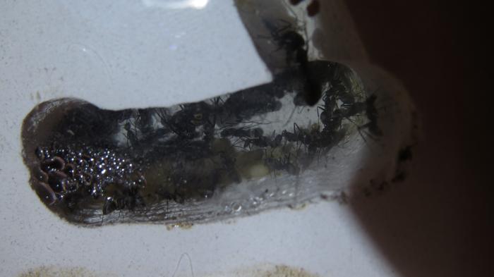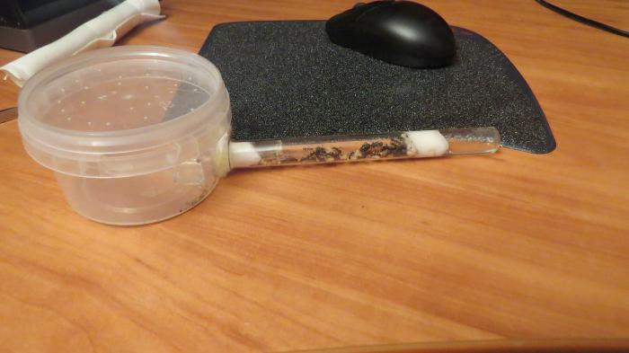 19 сентября 2013 года я стал обладателем колонии Camponotus dolendus, приобрёл их у Kentuki ( Олег ) за что ему огромное спасибо за этих интересных муравьёв! Со мной встретил тоже ещё одну колонию долендусов Mitya_ ( Дмитрий ), который тоже приобрёл этих муравьёв. Олег сказал, что этот вид у него из Малайзии, пойманы самки были вблизи Куала Лумпур. Колония приехала в составе 15 рабочих, самки и немного расплода. Первое впечатление - очень похожи на париусов, но как сказал Admin ( Николай ) * Это разные виды, просто очень схожи, пусть вырастут и посмотришь *. Я сам тоже в чём - то считаю что это долендусы. Информации по этому виду в Интернете мало, зато много видео на Ютубе. Если кто - то знает информацию по этому виду, буду благодарен. Сейчас лучше расскажу о долендусах. Колония в данный момент насчитывает 34 рабочих, матки, 15 коконов и кучу личинок. Едят много, по 2 брюшка мраморного таракана или одну крупную личинку мучного хрущака, сироп выпивают моментально. Кормлю каждый день, сегодня таракан, завра сахарный сироп, после сиропа даю крупную личинку мучняка. Вот такой рацион. Очень нравится у матки брюшко, чёрно - золотого цвета, рабочие чёрные, брюшко как у матки чёрно - золотое. Очень активный вид муравьёв, стукнешь по арене - начинается беготня. В отличии от париусов радует расплодом постоянно, развиваются быстро. Арену грею на термошнуре, долендусы сразу выносят обогревать все свои коконы. Им неделю назад сделал из банки для сыпучих продуктов ( 1,2 литра ) 4х камерный формик, в который я думаю они заселятся к марту. Вода в пробирке как раз заканчивается, вот щас достигнут 50 рабочих и переселю их в новый дом. Солдат пока нету и не ожидается среди расплоду, интересно, красивые они у них?).