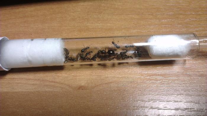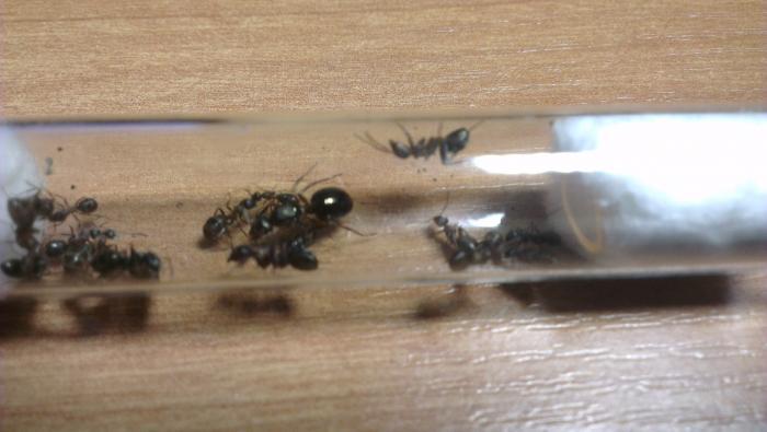 Через пару дней родились муравьи во всех инкубаторах. Матки ничего не делали, а только бегали из стороны в сторону, если их потревожить. Шло время, матки так и не откладывали яиц давал им и комариков, пока они не перестали их принимать, попробовал и увеличивать температуру, но все безнадежно. В итоге я решил отстать от муравьев и убрать их. Но однажды, очередной раз кормя их сахарным сиропом в одном из инкубаторов я увидел маленький пакет яиц. Я был очень рад, а посмотрев в другой инкубатор я тоже обнаружил пакет. В других двух колониях пакетов не было. В итоге эти колонии так и не развивались и я их отпустил. Но в колониях с пакетами жизнь закипела. Муравьи начали фуражировать по арене и искать пищу. Матки стали окончательно ленивыми, они не делали ничего кроме откладывания яиц. Через примерно месяц родились первые собственные муравьи. Они были маленькие, намного меньше чем их братья в лесу. Что мне не нравится в этих муравьях, так это то, что они очень грязные - они постоянно засоряли свой инкубатор. Из-за этого пришлось их переселять несколько раз, я боялся, что они муравьи могут отравиться.