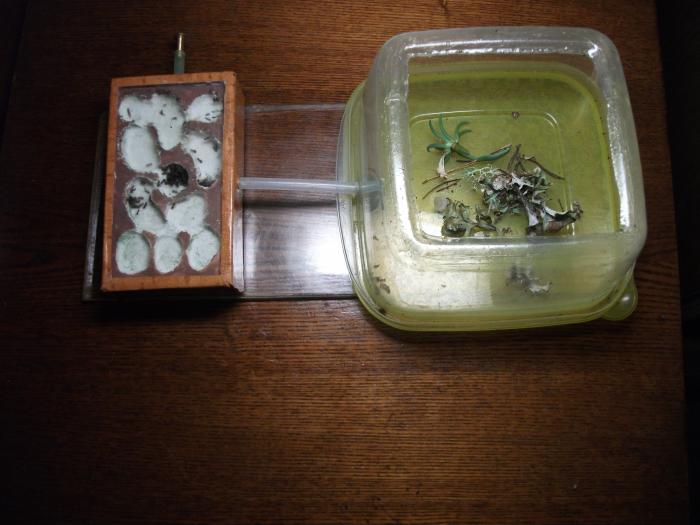 Так вот! Хочу заменить старый формик на новый, но новый хочу сделать из пластикового террариума Exo-Terra Faunarium такого как на фото размером (ДШВ): 23х15х17 см. Интересует как будет себя вести пластик под воздействием влаги? Не будет ли он мутнеть? Хочу сделать формик похожий на тот который на фото 2, но наполнитель будет гипс, камеры будут с трёх сторон( передней и двух боковых) с возможностью открывания боковых камер со временем когда колония будет побольше. Красить буду или охрой или хной (ну чтоб был коричневым) или посоветуйте коричневую краску которая не вредит мурашам. С верху наверное насыплю коричневого песочка на свежий жидкый гипс и приукрашу чем то.