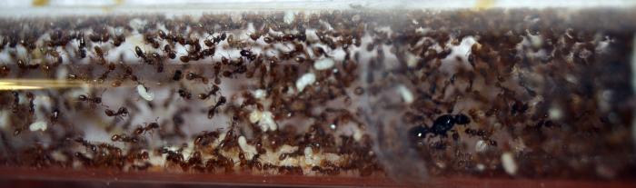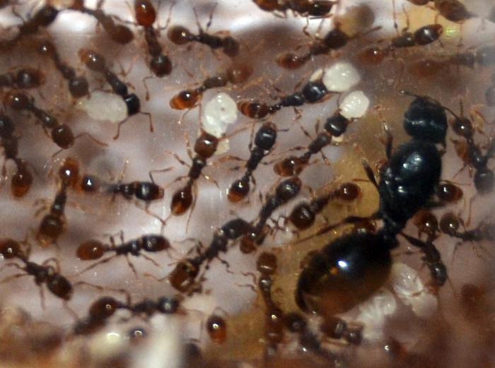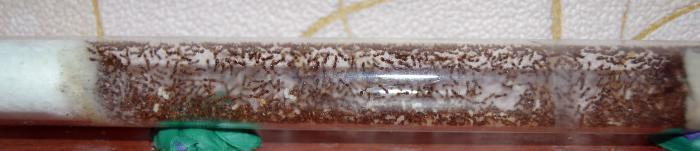Мои тетрики тоже бегают по квартире. Мне так и не удалось создать неприступную для них арену. Прорывают любую преграду. Чтобы не сожрали другие колонии держу их на полу под столом. Интересная черта - они не пытаются лезть на стол! И вообще, вверх не ходят. Гуляют по полу в радиусе 1 - 2 метра от формикария. Стараюсь, чтобы не голодали. Боюсь, что с голодухи попрутся дальше и наткнуться на другие формикарии. А при огромной численности, отваге и умении быстро мобилизоваться, они могут завалить любую из моих семей муравьев...