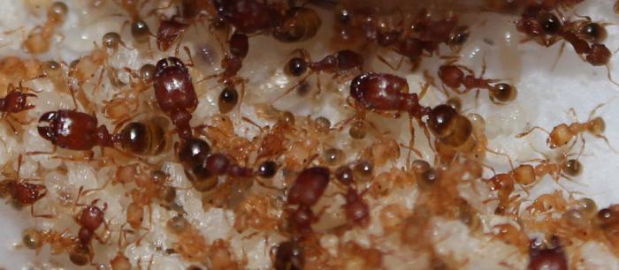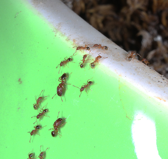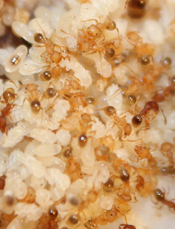 Хотел написать что-то по особенностям содержания, но их как таковых нет: маленький влаго- и теплолюбивый тропический вид. Есть как и соленопсис - все и в довольно больших количествах. Разбирают 20мм таракана за сутки. Развиваются очень быстро. Сам цикл от яица до рабочего явно меньше 30 дней. Точный период не засекал. Но и дикого разрастания нет. Очень удобный "карманный" муравей с солдатами, муравьиными дорожками, общей мобилизацией на кормовой участок - такой микромир в микромире.