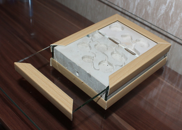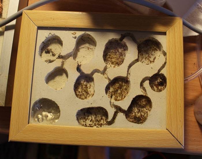 Материал само-собой гипс, как наиболее равномерно распределяющий и держащий влагу материал. Камеры вырезал согласно размерам муравьев. Надо сказать, получилось симпатично. Маленький формикарий на десяток камер смотрится как-то аккуратнее, чем большой на 3-4 камеры. Но специально мельчить не надо. Тут такой шаг вызван размером муравья.