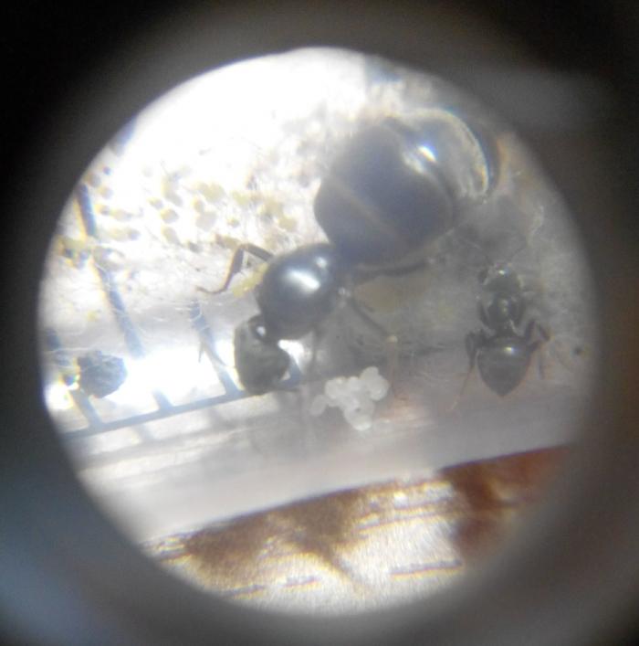 Это как раз кокон паразитической мухи, а яйцо у мухи маленькое, как и у муравья. Из него выводится личинка, которая питается внутренними органами (может яичниками) муравьиной матки, а потом окукливается это яйцо паразитической мухи ( вид мухи не помню ). Так бывает со многими матками, которые ищут укрытия для будущего муравейника, подлетает муха, которая вонзает свой яйцеклад в матку, тем самым вводя яйцо в матку. После этого, то, что у тебя в пробирке, это матка отложила это яйцо, которое росло внутри её. Из этого кокона появится муха, после этого матка обычно не сможет дальше основывать колонию.
