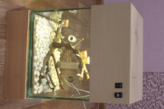 Так вот, арена функциональна: навесная кормушка, навесная поилка. Про навесную поилку я писал на форуме нашем, если кому интересно можете посмотреть ее конструкцию. По размерам арена размером лист А4. Аквариум на 1 сантиметр больше, чтобы по 5 мм от арены было расстояние.
