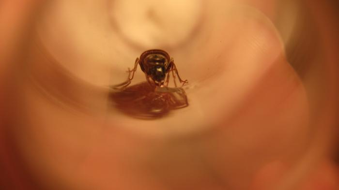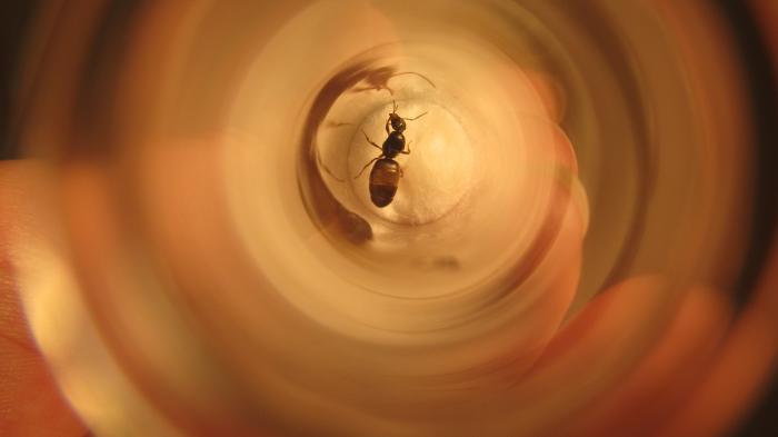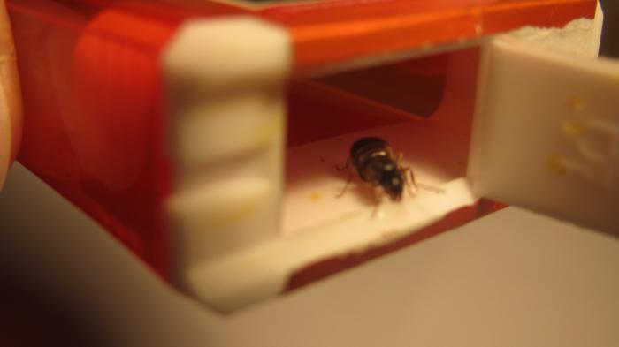 Кстати, при поимке она была помещена в случайно оказавшуюся в кармане коробочку от тик-так. По приходу домой, моментально был сделан инкубатор. Но я не вытряхивала её в пробирку. А сначала капнула капельку сиропа прямо в коробку возле матки. Она тут же её выпила. Следующая капля ждала у выхода... И ещё одна, уже в пробирке. Ни суеты, ни метаний не было. Матка просто следовала по каплям. В пробирке она выпила ещё 3 капли (и того всего 6!!!). Брюшко раздулось, вытянулось и ополосатилось. Выкладываю все фото по этому делу.