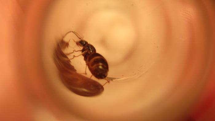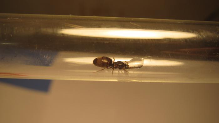 Первая в этом году матка была найдена случайно. Я изучала не знакомое мне гнездо вагусов. Причём сначала на коре дерева я заметила 1 жёлтого рабочего. Думаю, это был лазиус умбратус. Затем, изучая разломы я увидела Матку! Но она была в паутине и не подавала признаков жизни. Разглядывая пенёк, я обнаружила, что из ходов в сердцевине дерева, на меня кто-то смотрит. Очень робкие, поэтому я долго выжидала пока кто-нибудь из них выползет на свет. Оказались всё же вагусы. Видимо молодая семья. И тут же, на коре пенька, в одной из бороздок, я увидела её! По сравнению с вагусами она казалась крошкой. Я ловила в прошлом году маток лазиус нигер. И в принципе, она тоже лазиус. Но какой точно? При разном освещении её окрас сводит меня с ума! Подобрала я её с маленьким брюшком (даже думала,что это соц.паразит). Но обпившись сиропом, она уже "совсем другой человек" :))