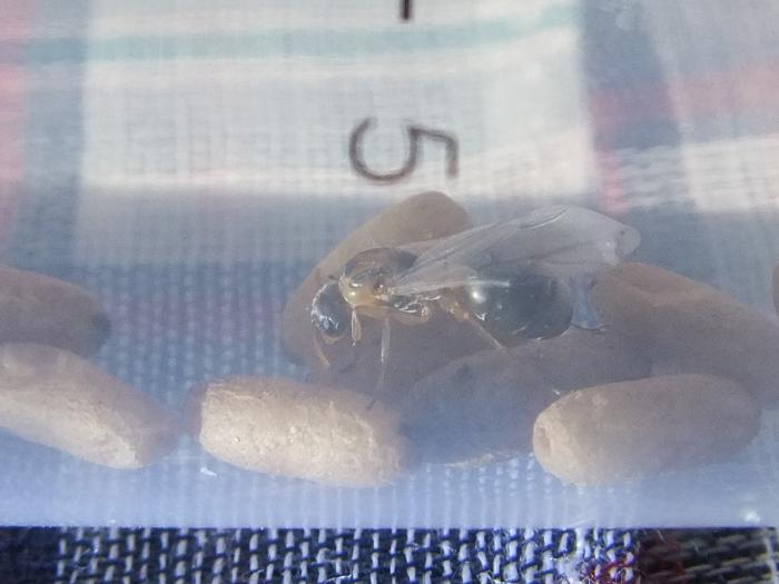 2. Pratensis (предположительно) - 7 подсаженных рабочих сервиформики + 10 коконов. Очень активны, первые 5 подкинутых коконов рабочие перенесли в шприц с маткой, остальные коконы до сих пор в шприце-арене. Вчера кинул придавленного мелкого туркменского таракана, добили его, но есть не стали.