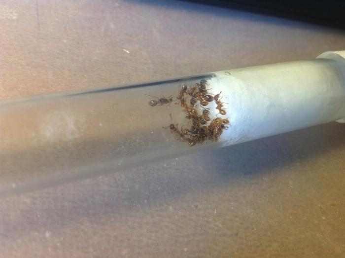 Ещё сегодня я пересадил "новых" мирмик в более чистую пробирку и подключил арену(соусницу).Насчёт трубки которая соединяет арену и пробирку,я стал пока не заморачиваться.И поэтому я использую трубочку от сока(чистую,конечно)А в место наполнителя арену я решил использовать вермикулит так как он хорошо держит влагу,что мирмики как раз и любят.Но я его пока не опрыскивал.Ещё почему-то у мирмик началась маленькая революция,и где-то рабочих 10 не смогли её пережить.Так же нормальные фотографии в пробирке тоже не смог сделать.В пробирке стекло какое-то искажённое и не очень чёткое(Айпад сфокусироваться не может нормально)