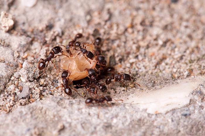 Судя по всему гнездо у них распределённое. Там штук 8 поленьев с выходами ходов. В одном из них вчера была обнаружена активная строительная деятельность. Рабочие выходят из глубины ходов и сбрасывают вниз опилки. Вероятно это одно из гнёзд. Я решил положить на дорогу кусочки мяса и посмотреть, куда рабочие будут нести провиант. Рабочие, как ожидалось, носили оторванные кусочки в обнаруженное гнездо. Однако присмотревшись, я увидел, что вереница носильщиков выходит с другой стороны бревна и тянется в противоположный конец кладки дров, к другому полену с выходами, где строительные работы не ведутся.